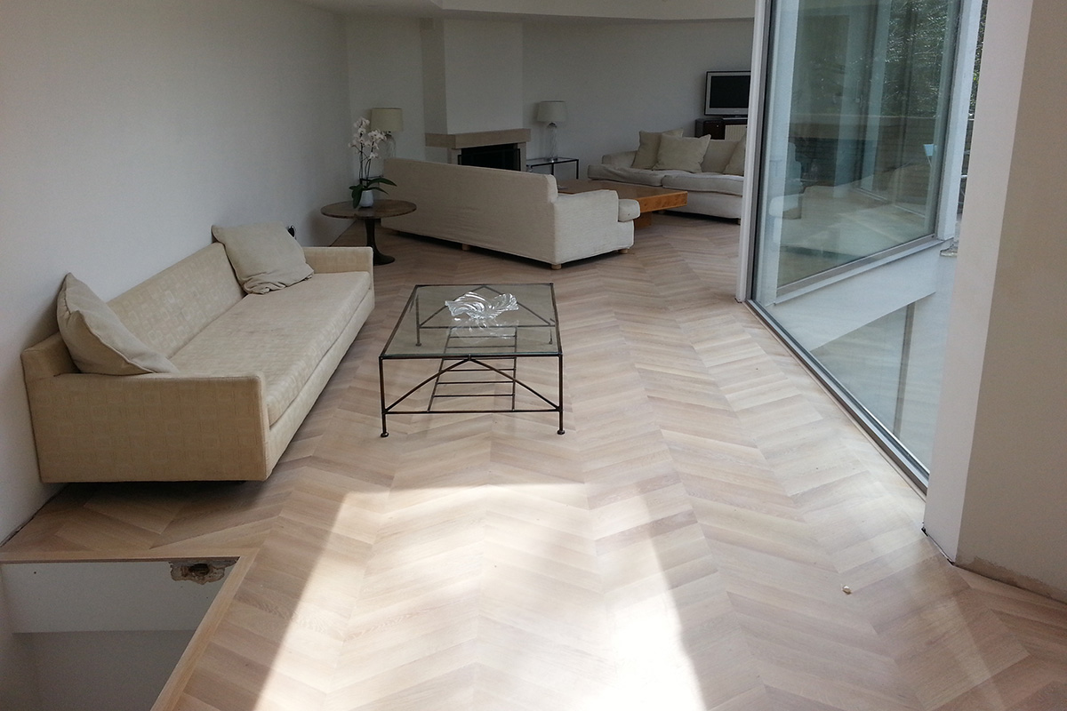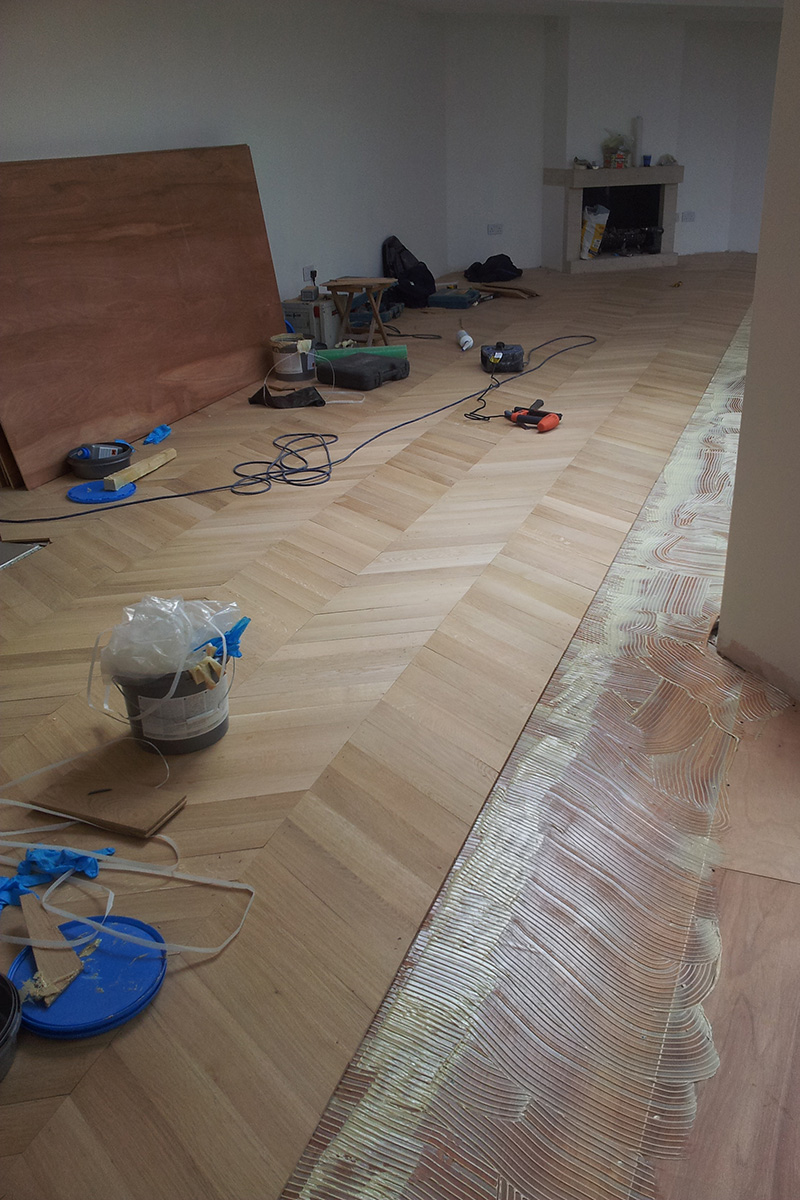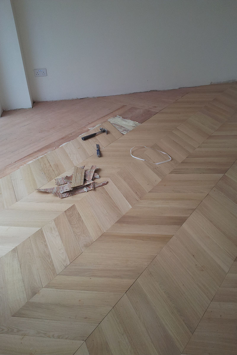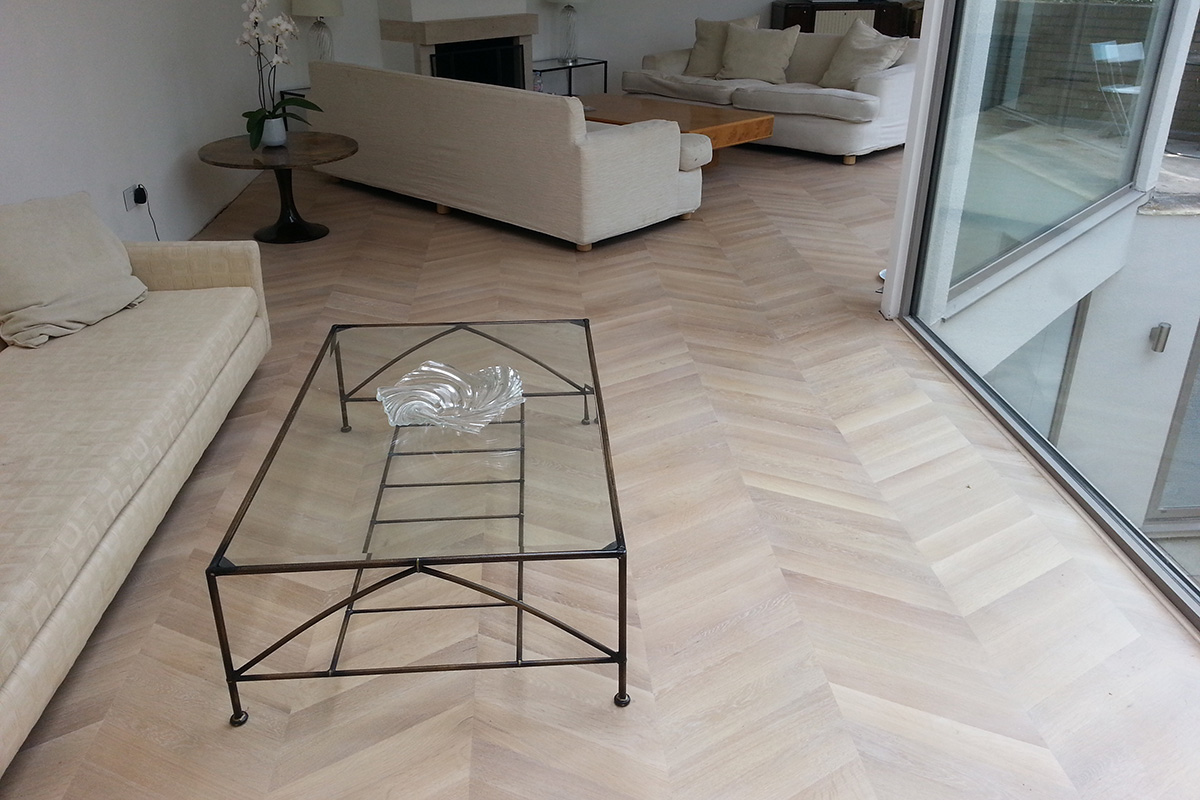 07-April-2013 Chevron Parquet By: Kin / Parquet Floor Fitting Solid oak Chevron Parquet flooring fully glued down, polished and white oiled on site for a contemporary look. Client: Residential Property Location: Hampstead, NW3