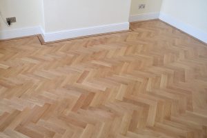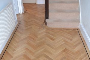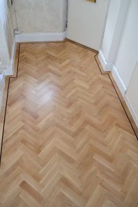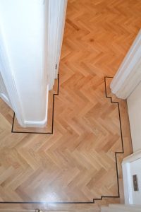 05-March-2014 Herringbone Oak Flooring with Border By: Kin / Parquet Floor Fitting Herringbone oak flooring with border feature strip in wenge. All pieces are solid wood, fully glued down, sanded and lacquered on site. Client: Residential Property Location: New Southgate, London