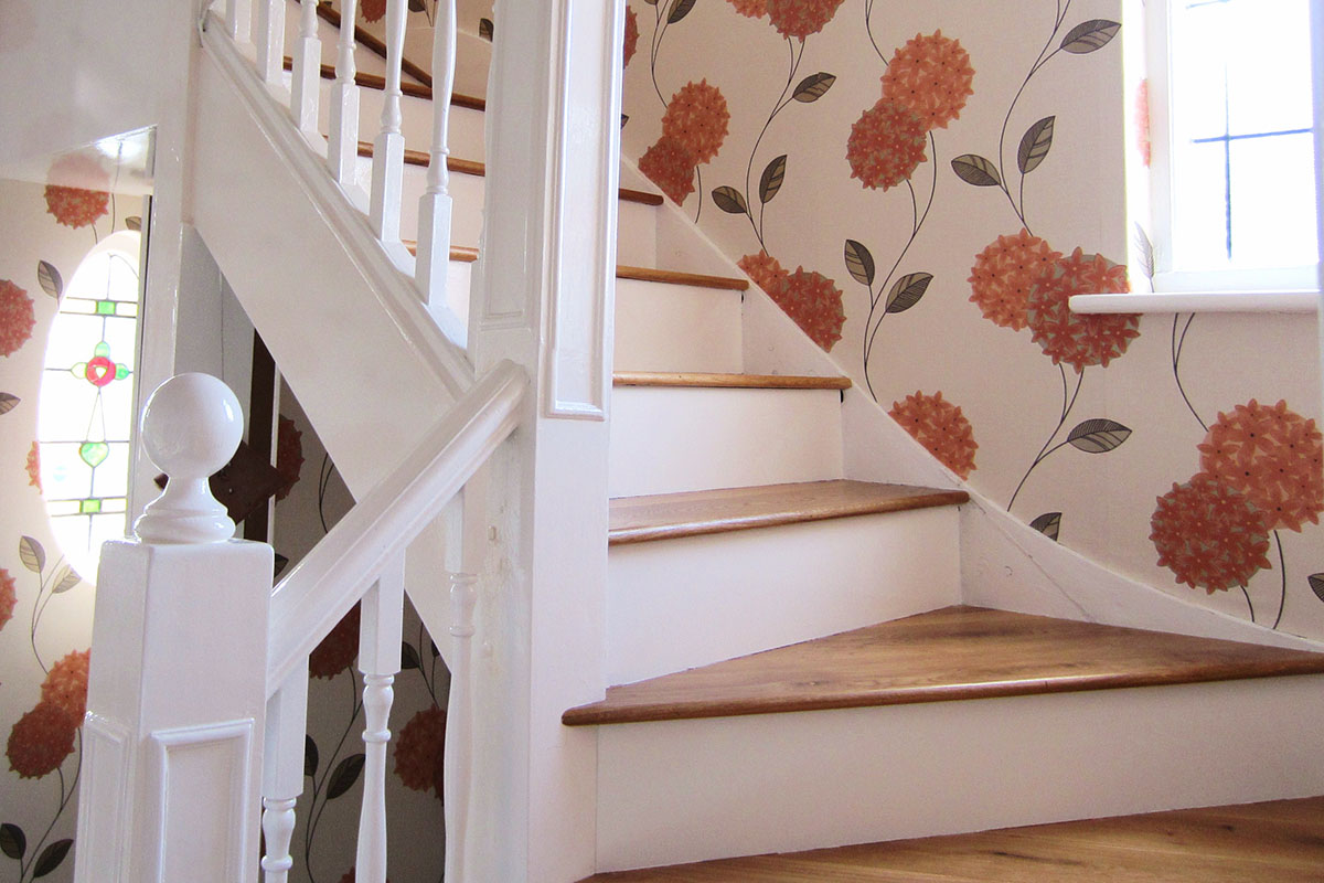 09-February-2012 Solid Oak Stairs By: Kin / Solid Wood Steps Solid Oak Steps in natural colour with painted white risers. Steps are fully glued down onto the existing staircase. The risers have been painted to provide contrast. Client: Residential Property Location: Wembley, HA4