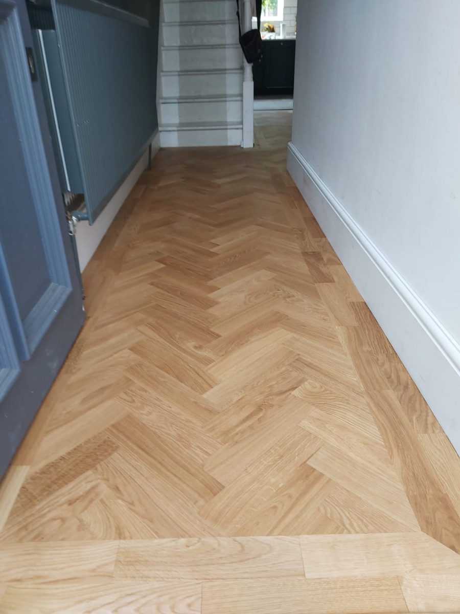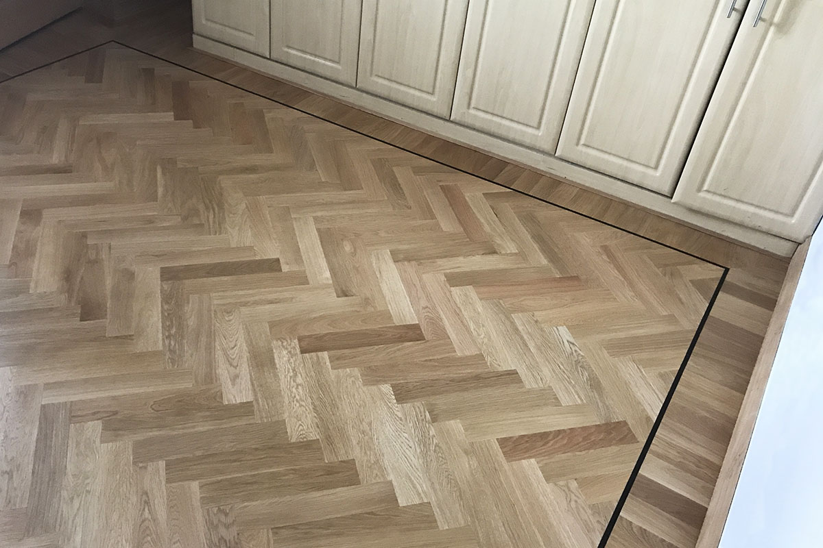 Solid Oak Parquet flooring, installed in traditional herringbone pattern